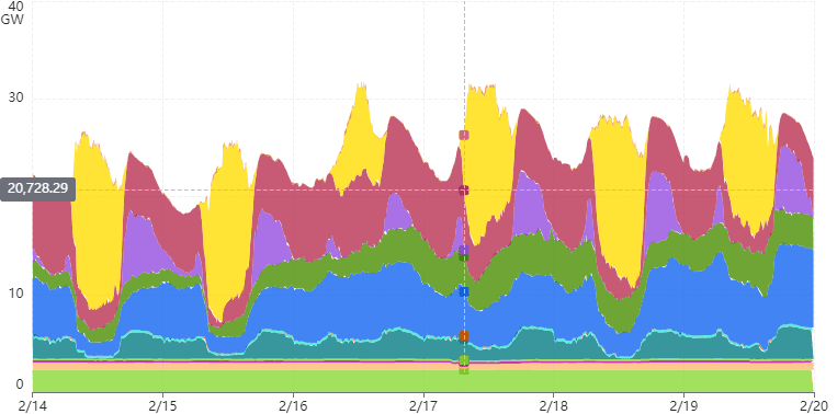 The images below from the Cal ISO Live Dashboard provide interesting insights into the operation of a renewables intensive, capacity constrained grid. Solar generation dominates the generation mix on most days over the period shown, with the exception of 2/16, during daylight hours. Wind generation was available variably but continuously over the period. Storage provided power each day during the evening “duck curve” peak. Large hydro was also increased during the evening “duck curve” peak. Nuclear, geothermal, biomass and biogas generation operated continually throughout the period. Load following generation was provided primarily by natural gas generation and imports. CA ISO does not estimate the contribution of behind-the-meter solar generation, though it totals approximately 20 GW of generating capacity.