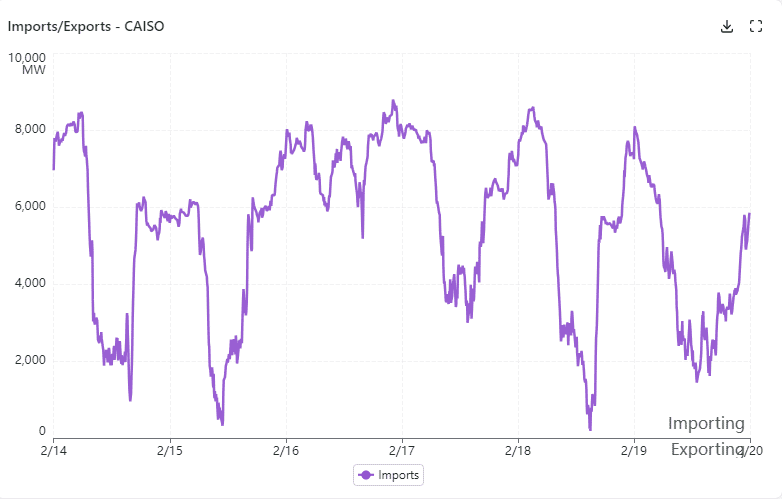 CA ISO imported electricity at widely variable rates throughout the period. No power was exported from CA ISO during the period. Imports exceeded 8 GW at peak on 5 of the 6 days, or approximately 25% - 40% of daily peak load.