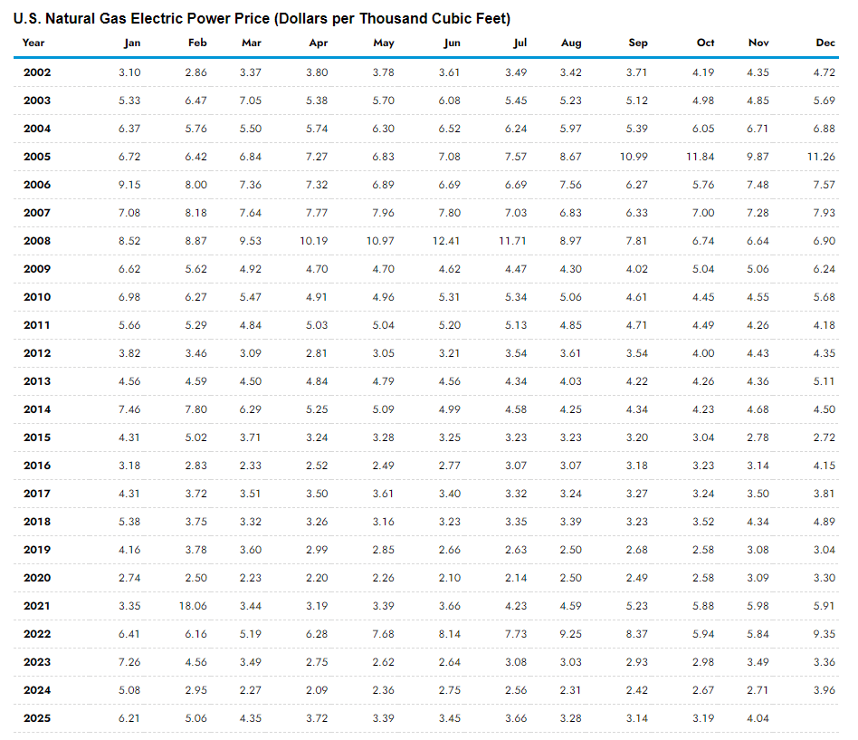 Greene’s comment particularly noted the increase in the natural gas price in January 2025 ($6.21/mcf) versus the January 2002 price ($3.10/mcf), a difference of $3.11 per mcf. Therefore, we will calculate the electricity rate impact of that increase.