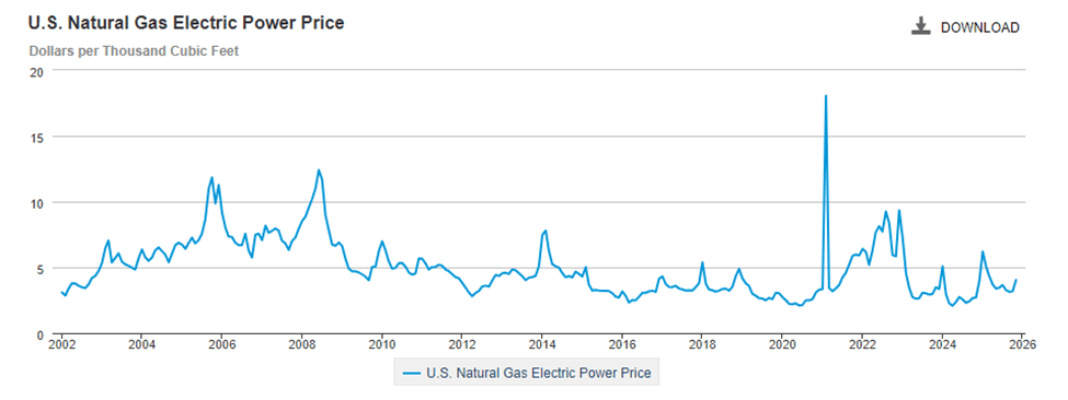 Natural gas generates ~40% of US electricity annually. Therefore, an increase of $0.02/kwh in the price of natural gas generated electricity would contribute ~0.008/kwh to ~$0.009 to the US residential electricity price, or ~4% compared to the overall 123% increase in electricity prices. The increased natural gas price of $7.72 in January 2026 would have resulted in price difference of $4.61/mcf from the January 2002 price, or a difference of approximately $0.03/kwh, or ~6%.