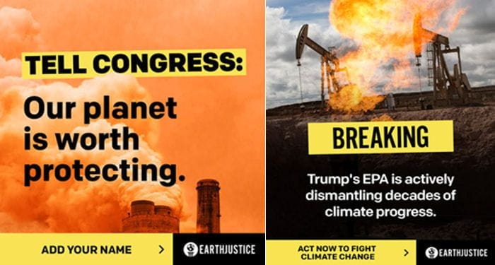 The image on the left below urges support of a petition to Congress to continue the renewable transition, ignoring the fact that global emissions continue to rise because of the increasing use of coal and natural gas by developing nations focused on economic growth rather than climate action. The image on the right below seeks support for petitions opposing EPA’s effort to retract the 2009 Endangerment Finding and the Power Plant Rule.