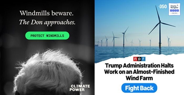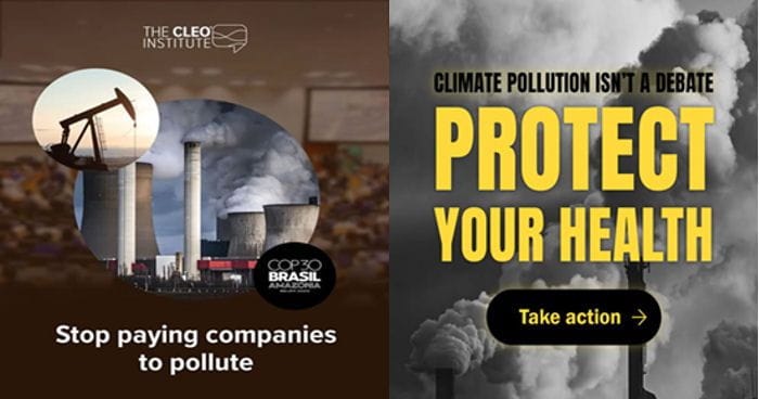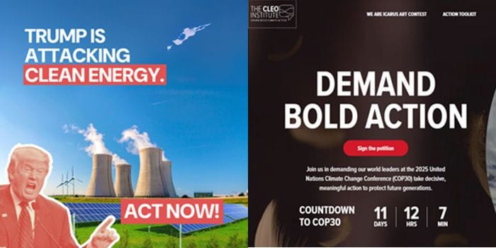 The image on the left below ignores the Trump Administration’s support for nuclear electricity generation which is clean and dispatchable as an alternative to intermittent renewables such as wind and solar. The image on the right below encourages petition signatures supporting strong action at COP30, which was intended to achieve a resolution to ban fossil fuels.