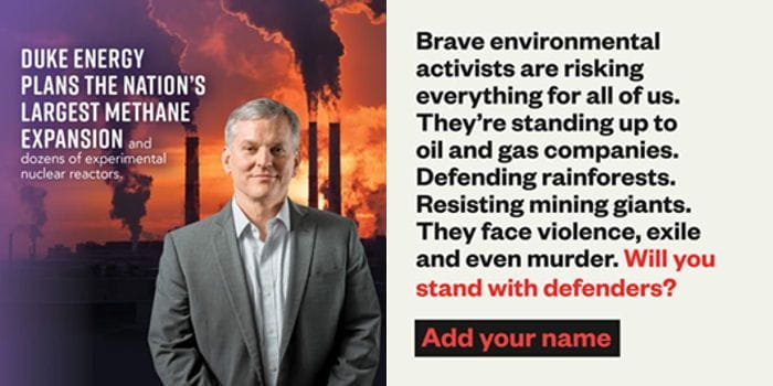 The image on the left below encourages North Carolina governor Josh Stein to take action to redirect Duke Energy’s generation expansion plans toward renewables and storage. It assumes that the NC Utility Commission is not acting appropriately on Duke’s expansion plans. The image on the right below suggests that brave environmentalists are risking life and limb resisting climate change, which might be just a bit of hyperbole.