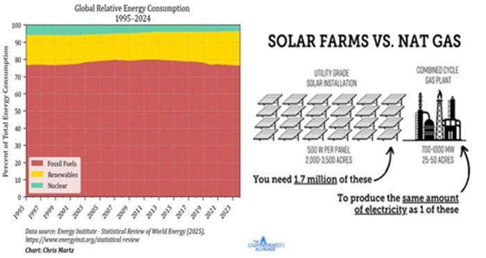 The image on the left below shows the relatively modest change in global energy consumption by source, with fossil fuels retaining a roughly 75% share despite 30 years of efforts to eliminate fossil fuel use.