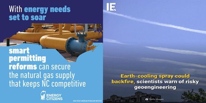 The image on the left below advocates for energy infrastructure permitting reforms. The image on the right below warns of the dangers of geoengineering, which is currently being analyzed as a weapon of climate war rather than beneficial climate management.