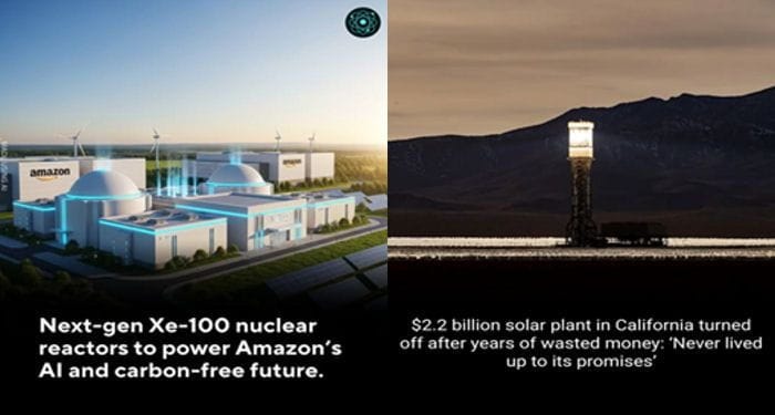 The image on the left below is an artists rendering of a planned Amazon data center to be powered by small modular nuclear reactor (SMR) generators. The image on the right below is the Ivanpah solar power tower generator scheduled to be shut down next Spring for poor performance.