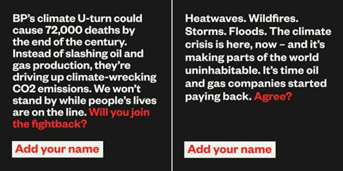 The image on the left below solicits resistance to BP’s shift away from renewables and refocus on its core energy business, based on an unsupported estimate of death which might result. The image on the right below appears to solicit support for climate lawfare against oil and gas companies on the basis that they are causing the “climate crisis”, although there is no climate crisis. Interestingly, it ignores coal companies, likely because there is less money available to be “recovered” from them.